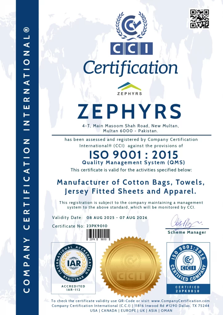 Committed with the Sustainable Development Goals, and a sustainable earth, Zephyrs comply the requirements of Oekotex and got certified in 2012. We went for ISO-9001 in 2016 to improve our management standards. With the new development, that were aligned to our own commitments, we got GRS (Global Recycled Standard) and RCS (Recycled Claim Standard), in 2022. We were concerned about our own employees/workers (in specific) and the society (in general); our operations and other activities were already aligned to the cause, however, we got Sedex in 2022. We had been thinking about fairer terms for farmers and workers in cotton trade; We learnt about Fair Trade International, studied it, agreed with the cause and joined the Fair Trade supply chain as a certified member in 2023.